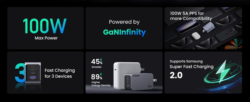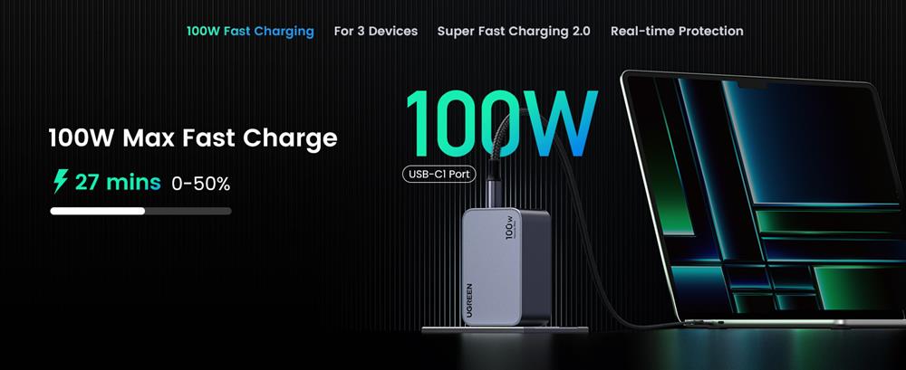 UGREEN CD226 (40747) Nexode GaN Fast Charger, 3xUSB-C, USB-A, 100W, Black