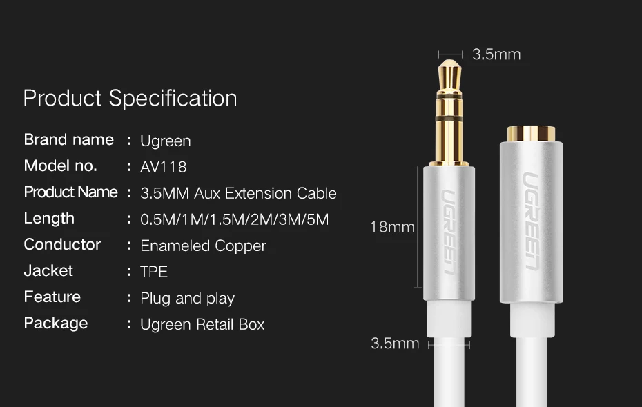 აუდიო კაბელი Ugreen AV118 (10778) Jack 3.5Mm Audio Extension Cable Male To Female Aux Cable 5M Headphone Extension