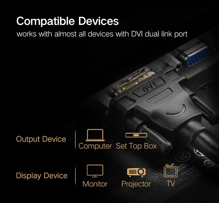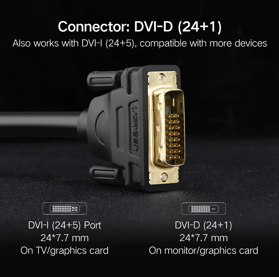 DVI კაბელი UGREEN DV101 (11672) DVI (24+1) Male to Male Cable Gold Plated 1m (Black)