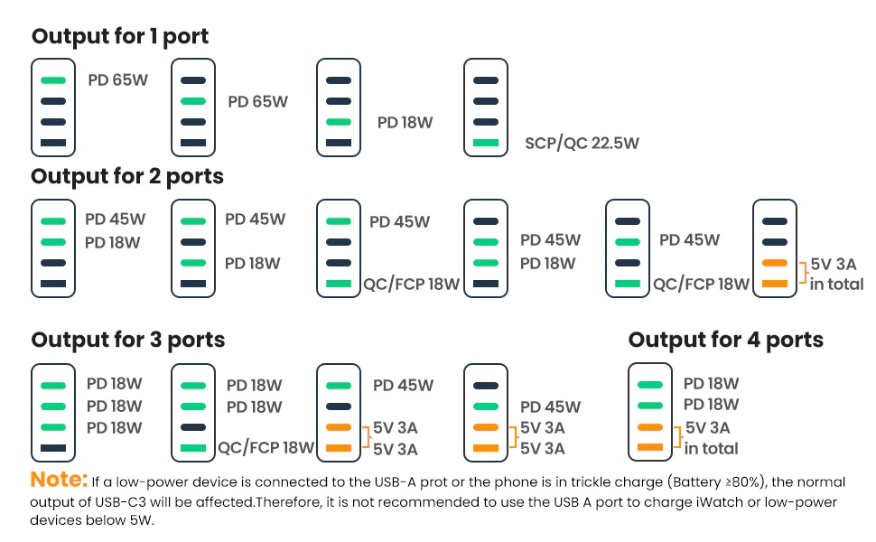⚡ USB-A გამომავალი: DC 4.5V/5A, 5V/4.5A, 5V/3A, 9V/2A, 12V/1.5A